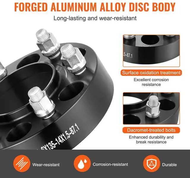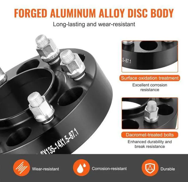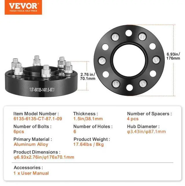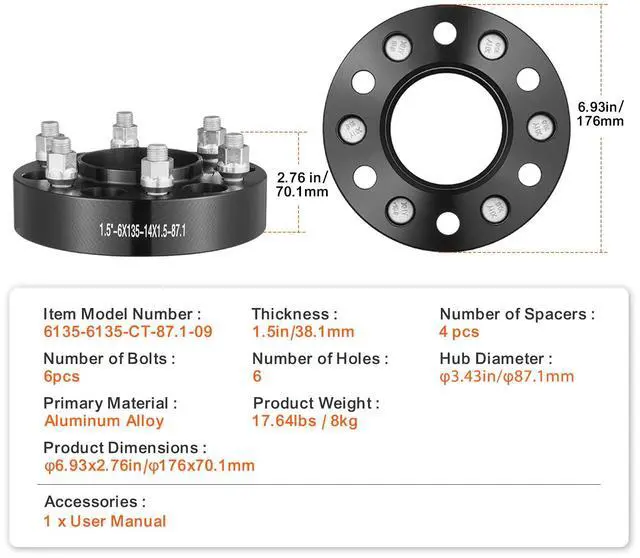Thickness: 1.5 inch / 38.1mm,Primary Material: Aluminum Alloy,Number of Bolts: 6 pcs,Number of Holes: 6,Hub Diameter: 3.43 inch / 87.1mm,Item Model Number: 6135-6135-CT-87.1-09,Product Weight: 17.64 lbs / 8 kg,Number of Spacers: 4 pcs,Product Dimensions: 6.93x2.76 inch / 176x70.1mm