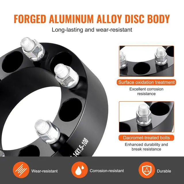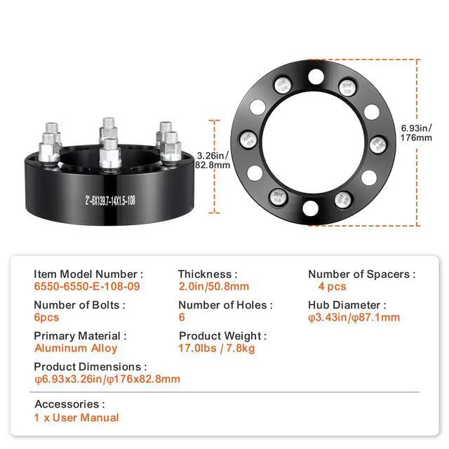 Thickness: 2 inch / 50.8mm,Primary Material: Aluminum Alloy,Number of Bolts: 6 pcs,Number of Holes: 6,Hub Diameter: 4.25 inch / 108mm,Item Model Number: 6550-6550-E-108-09,Product Weight: 17.0 lbs / 7.8 kg,Number of Spacers: 4 pcs,Product Dimensions: 6.93x3.26 inch / 176x82.8mm
