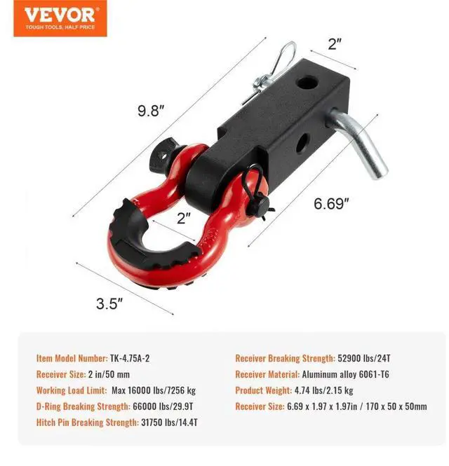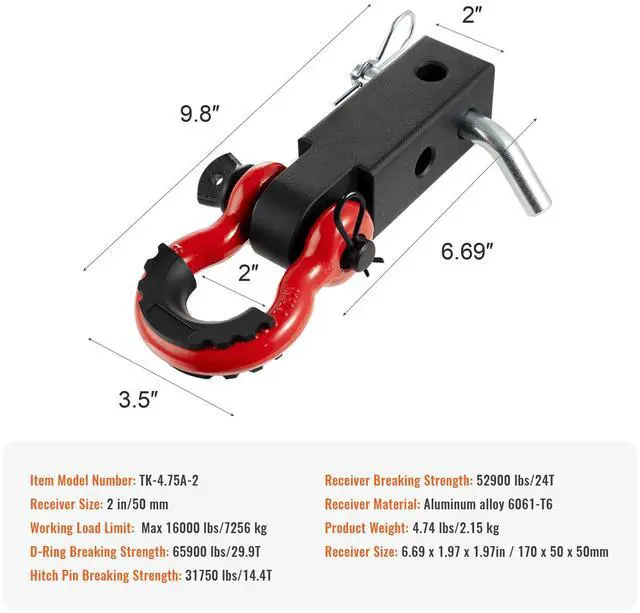Receiver Material: Aluminum Alloy 6061-T6,D-Ring Breaking Strength: 65900 lbs/29.9T,Item Model Number: TK-4.75A-2,Product Weight: 4.74 lbs/2.15 kg,Product Size (Receiver): 6.69 x 1.97 x 1.97 in/170 x 50 x 50 mm,Receiver Breaking Strength: 52900 lbs/24T,Receiver Size: 2 in/50 mm,Working Load Limit: Max 16000 lbs/7256 kg,Hitch Pin Breaking Strength: 31750 lbs/14.4T