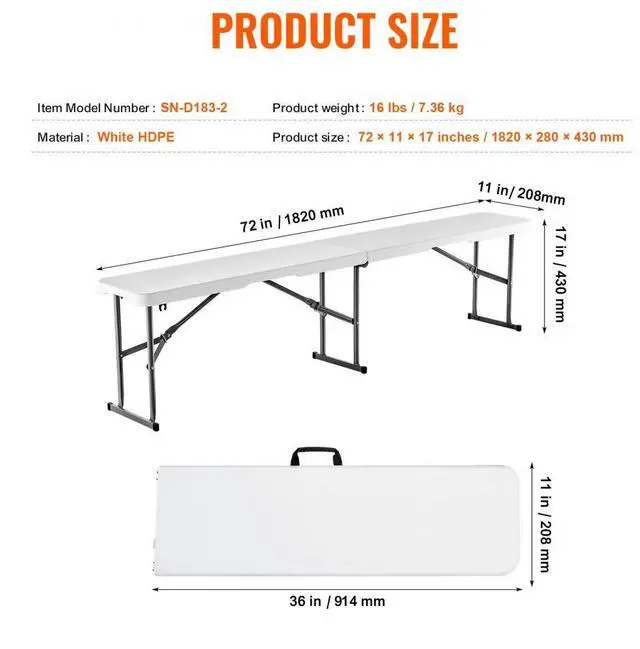 VEVOR 6FT Plastic Folding Bench Portable Outdoor Bench for Picnic Camping Garden