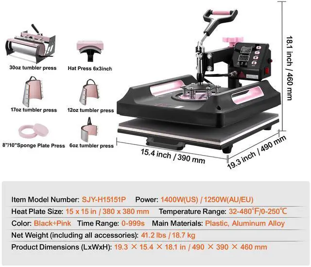 Heat Plate Size: 15 x 15 in / 380 x 380 mm,Main Materials: Plastic, Aluminum Alloy,Net Weight (including all accessories): 41.2 lbs / 18.7 kg,Time Range: 0-999s,Color: Black,Item Model Number: SJY-H15151P,Temperature Range: 32-480/0-250,Power: 1150W(US) / 1050W(EU)