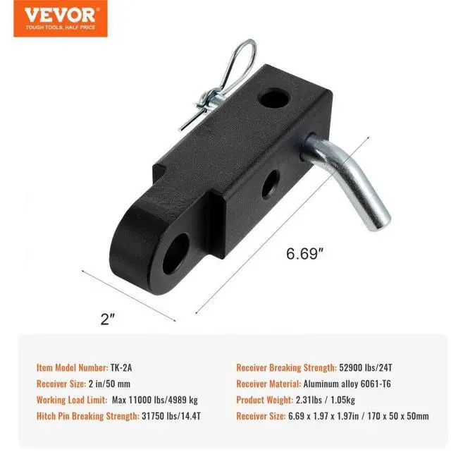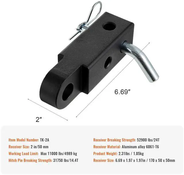 Receiver Material: Aluminum Alloy 6061-T6,Item Model Number: TK-2A,Product Weight: 2.31 lbs/1.05 kg,Product Size (Receiver): 6.69 x 1.97 x 1.97 in/170 x 50 x 50 mm,Receiver Breaking Strength: 52900 lbs/24T,Receiver Size: 2 in/50 mm,Working Load Limit: Max 11000 lbs/4989 kg,Hitch Pin Breaking Strength: 31750 lbs/14.4T