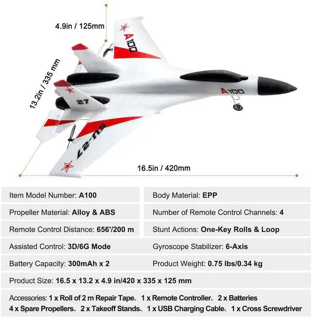 Propeller Material: Alloy & ABS,Product Size: 16.5 x 13.2 x 4.9 in/420 x 335 x 125 mm,Design: Fighter,Body Material: EPP,Battery Capacity: 300mAh x 2,Remote Control Distance: 656'/200 m,Gyroscope Stabilizer: 6-Axis,Assisted Control: 3D/6G Mode,Item Model Number: A100,Stunt Actions: One-Key Rolls & Loop,Product Weight: 0.75 lbs/0.34 kg,Number of Remote Control Channels: 4,Wingspan: 13.2 in/33.5 cm