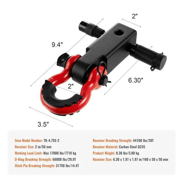 Receiver Material: Carbon Steel Q235,D-Ring Breaking Strength: 66000 lbs/29.9T,Item Model Number: TK-4.75S-2,Product Weight: 8.38 lbs/3.80 kg,Product Size (Receiver): 6.30 x 1.97 x 1.97 in/160 x 50 x 50 mm,Receiver Breaking Strength: 44100 lbs/20T,Receiver Size: 2 in/50 mm,Working Load Limit: Max 17000 lbs/7710 kg,Hitch Pin Breaking Strength: 31750 lbs/14.4T