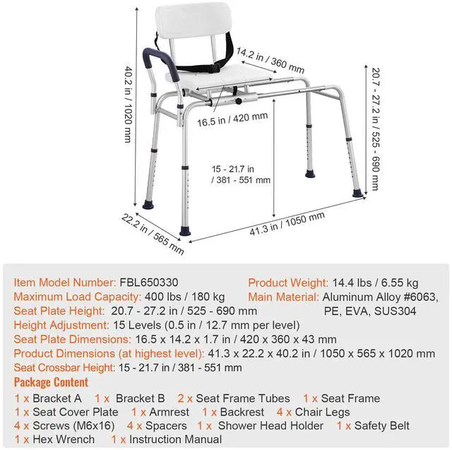 At Lowest Level: 39.8 x 21.7 x 33.1 in / 1010 x 550 x 840 mm,Height Adjustment: 15 Levels (0.5 in / 12.7 mm per level),Main Materials: Aluminum Alloy #6063, PE, EVA, SUS304,Backrest Dimensions: 16.1 x 7.1 in / 410 x 180 mm,Seat Plate Dimensions: 16.1 x 13.4 x 1.7 in/ 410 x 340 x 43 mm,Item Model Number: FBL650329,Maximum Load Capacity: 400 lbs / 180 kg,Product Weight: 14.4 lbs / 6.55 kg,At Highest Level: 41.3 x 22.2 x 40.2 in / 1050 x 565 x 1020 mm,Product Dimensions:,Seat Plate Height: 20.7 - 27.2 in / 525 - 690 mm