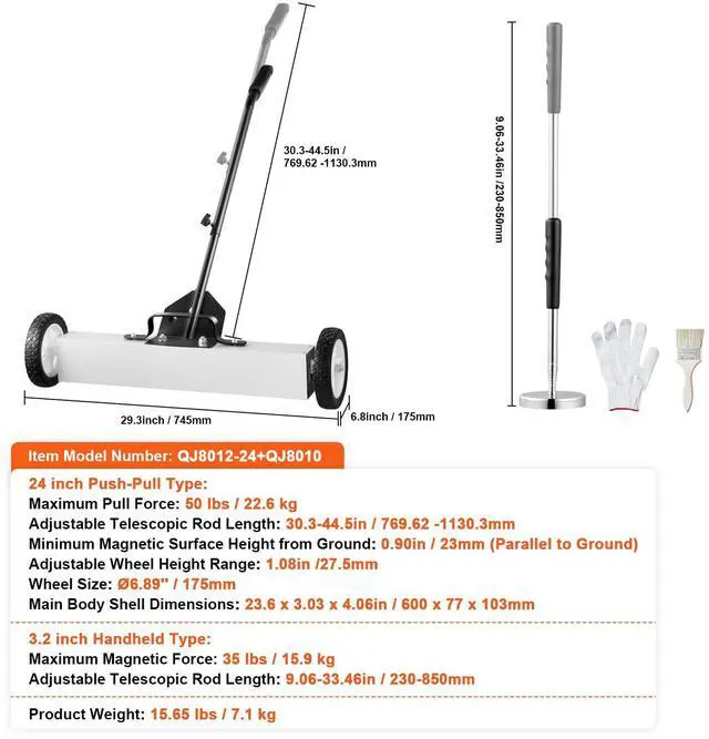Wheel Size: Ø6.89" / 175mm,3.2 inch Maximum Magnetic Force: 35 lbs / 15.9 kg,24 inch Adjustable Telescopic Rod Length: 30.3-44.5in / 769.62 -1130.3mm,Main Body Shell Dimensions: 23.6 x 3.03 x 4.06 in/600 x 77 x 103 mm,24 inch Maximum Pull Force: 50lbs /22.6kg,Item Model Number: QJ8012-24+QJ8010,Adjustable Wheel Height Range: 1.08in / 27.5mm,Minimum Magnetic Surface Height from Ground: 0.90in / 23mm (Parallel to Ground),3.2 inch Adjustable Telescopic Rod Length: 9.06-33.46in / 230-850mm