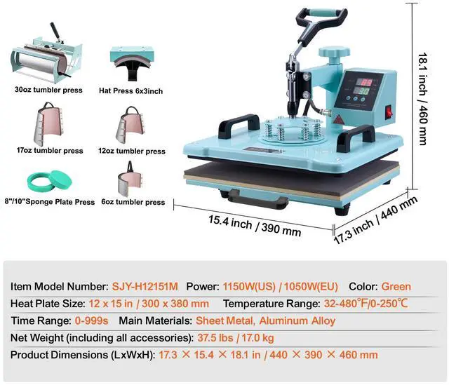 Heat Plate Size: 12 x 15 in / 300 x 380 mm,Main Materials: Sheet Metal, Aluminum Alloy,Net Weight (including all accessories): 37.5 lbs / 17.0 kg,Time Range: 0-999s,Color: Green,Item Model Number: SJY-H12151M,Temperature Range: 32-480/0-250,Power: 1150W(US) / 1050W(AU/EU)