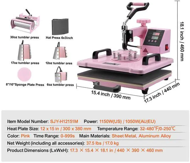 Versatile Heat Press: The 8-in-1 multifunctional heat press machine comes with multiple attachments, allowing your creativity to expand without limits. Whether you want to transfer beautiful designs onto T-shirts, pillowcases, hats, mugs, or ceramic plates, our heat press makes it easy. It is equipped with 6oz/12oz/17oz/30oz tumbler press attachments. The upgraded 30oz large size can handle two mugs at a time, greatly enhancing work efficiency!