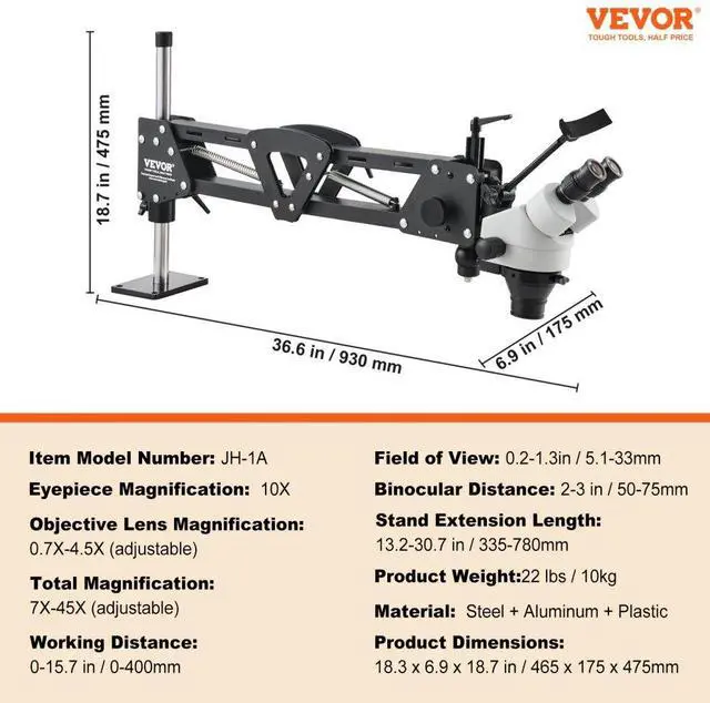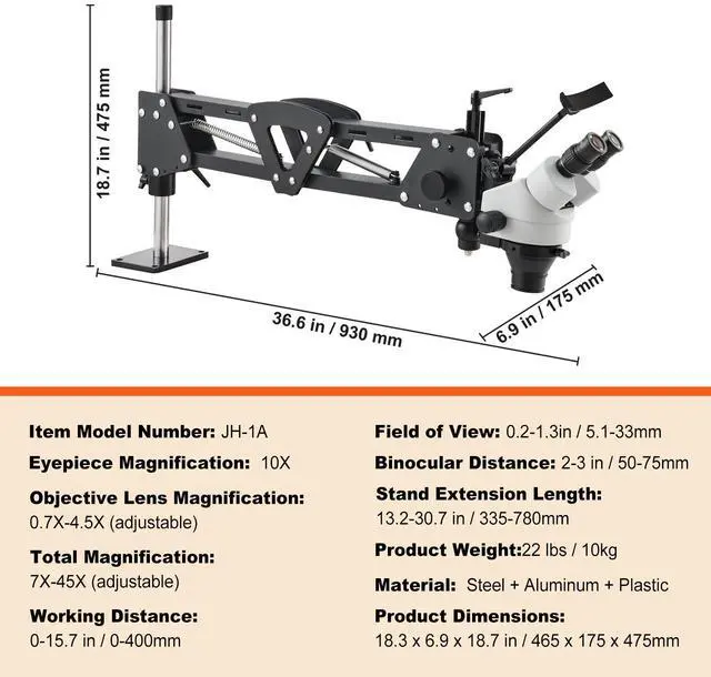 Working Distance: 0-15.7 in / 0-400mm,Binocular Distance: 2-3 in / 50-75mm,Total Magnification: 7X-45X (adjustable),Item Model Number: JH-1A,Eyepiece Magnification: 10X,Product Weight: 22 lbs / 10kg,Material: Steel + Aluminum + Plastic,Objective Lens Magnification: 0.7X-4.5X (adjustable),Product Dimensions: 18.3 x 6.9 x 18.7 in / 465 x 175 x 475mm,Field of View: 0.2-1.3in / 5.1-33mm,Stand Extension Length: 13.2-30.7 in / 335-780mm