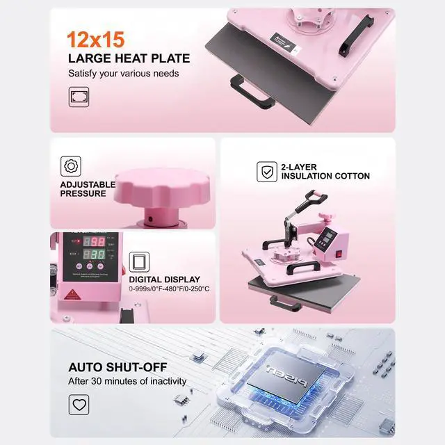 Heat Plate Size: 12 x 15 in / 300 x 380 mm,Main Materials: Sheet Metal, Aluminum Alloy,Net Weight (including all accessories): 34.8 lbs / 15.8 kg,Time Range: 0-999s,Color: Pink,Item Model Number: SJY-H12151M,Temperature Range: 32-480/0-250,Power: 1150W(US) / 1050W(AU/EU)