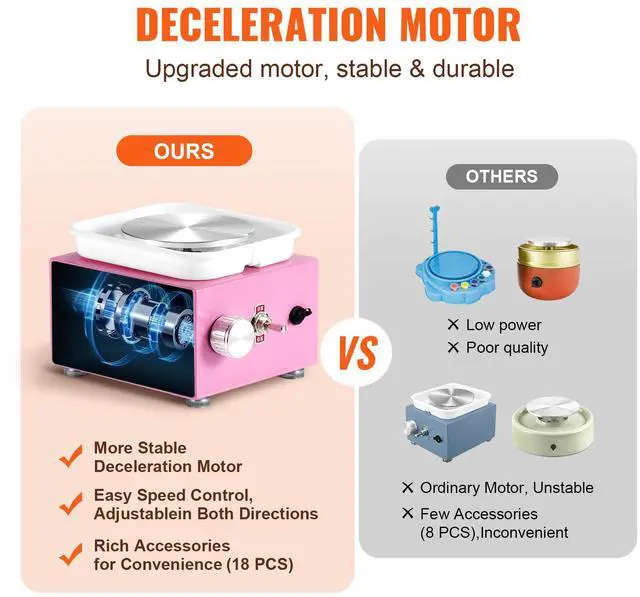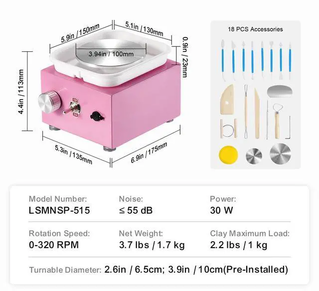Maximum Power: 30 W,Noise: 55dB,Color: Pink,Item Model Number: LSMNSP-515,Max Pottery Weight Capacity: 2.2 lbs / 1 kg,Pre-Installed Wheel Size: 3.94" / 10 cm,Speed Range: 0-320 RPM