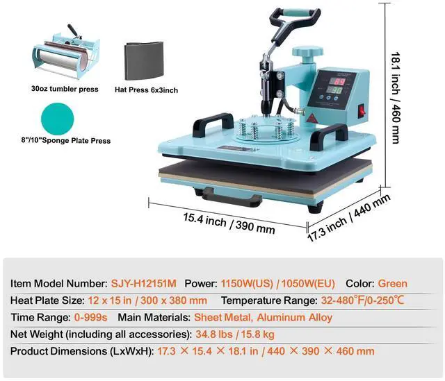 Heat Plate Size: 12 x 15 in / 300 x 380 mm,Main Materials: Sheet Metal, Aluminum Alloy,Net Weight (including all accessories): 34.8 lbs / 15.8 kg,Time Range: 0-999s,Color: Green,Item Model Number: SJY-H12151M,Temperature Range: 32-480/0-250,Power: 1150W(US) / 1050W(AU/EU)