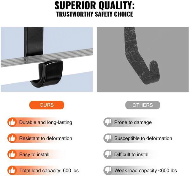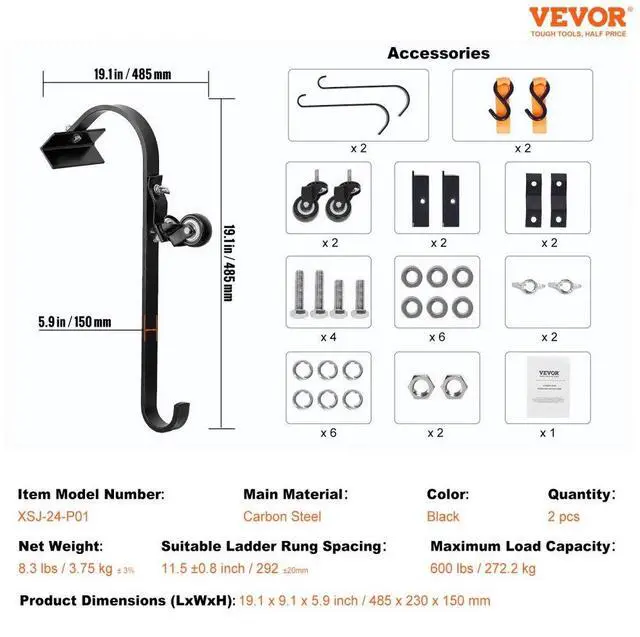 Product Dimensions (LxWxH): 19.1 x 9.1 x 5.9 inch / 485 x 230 x 150 mm,Color: Black,Suitable Ladder Rung Spacing: 11.5 ±0.8 inch / 292 ±20mm,Model: XSJ-24-P01,Maximum Load Capacity: 600 lbs / 272.2 kg,Quantity: 2 pcs,Net Weight: 8.3 lbs / 3.75 kg ± 3%,Main Material: Carbon Steel
