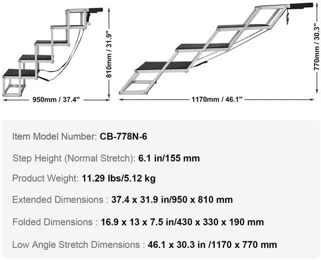 Step Height (Extended): 6.1 in/155 mm,Item Model Number: CB-778N-6,Product Weight: 11.29 lbs/5.12 kg,Low Angle Extended Dimensions: 46.1 x 30.3 in /1170 x 770 mm,Extended Dimensions: 37.4 x 31.9 in/950 x 810 mm,Folded Dimensions: 16.9 x 13 x 7.5 in/430 x 330 x 190 mm