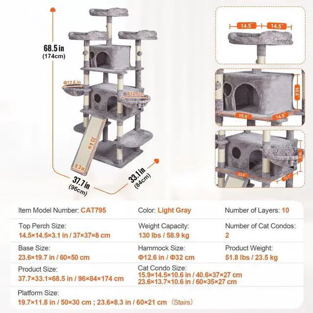 Cat Condo Size: 15.9"×14.5"×10.6"/40.6×37×27 cm;23.6"×13.7"×10.6"/60×35×27cm,Hammock Size: 12.6"/32cm,Top Perch Size: 14.5"×14.5"×3.1 "/37×37×8 cm,Number of Layers: 10,Number of Cat Condos: 2,Weight Capacity: 130 lbs/58.9 kg,Base Size: 23.6"×19.7"/60×50cm,Color: Light Grey,Item Model Number: CAT796,Product Weight: 51.8 lbs/23.5 kg,Product Size: 37.7"×33.1"×68.5"/96×84×174 cm