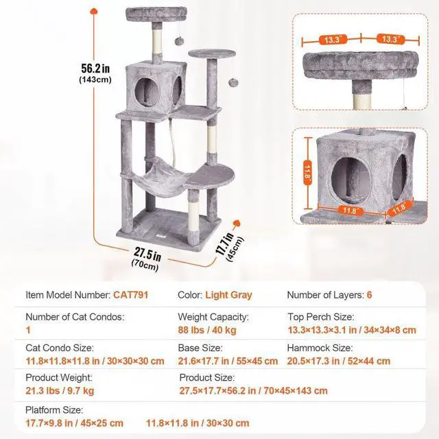 Cat Condo Size: 11.8"×11.8"×11.8"/30×30×30cm,Hammock Size: 20.5"×17.3"/52×44cm,Top Perch Size: 13.3"×13.3"×3.1"/34×34×8 cm,Number of Layers: 6,Number of Cat Condos: 1,Weight Capacity: 88lbs/40kg,Base Size: 15.7"×12.6"/40×32cm,Color: Light Grey,Item Model Number: CAT791,Product Weight: 21.3 lbs/9.7 kg,Product Size: 27.5"×17.7"×56.2"/70×45×143 cm