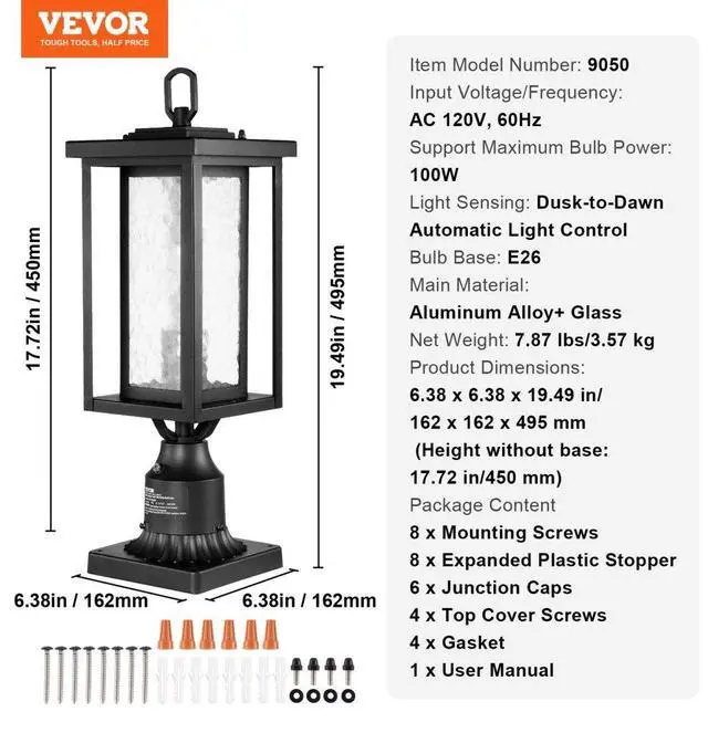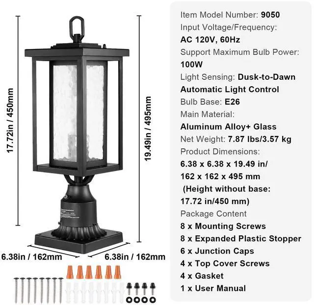 Bulb Base: E26,Support Maximum Bulb Power: 100W,Light Sensing: Dusk-to-Dawn Automatic Light Control,Item Model Number: 9050,Product Dimensions: 6.38 x 6.38 x 19.49 in/162 x 162 x 495 mm (Height without base: 17.72 in/450 mm),Input Voltage/Frequency: AC 120V, 60Hz,Net Weight: 7.87 lbs/3.57 kg,Main Material: Aluminum Alloy+ Glass