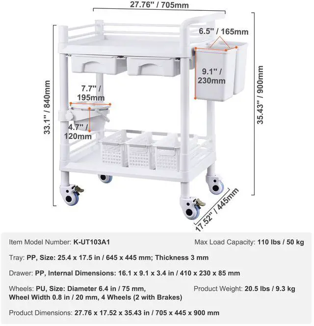 Tray: PP, Size: 25.4 x 17.5 in / 645 x 445 mm; Thickness 3 mm,Wheels: PU, Size: Diameter 6.4 in / 75 mm, Wheel Width 0.8 in / 20 mm, 4 Wheels (2 with Brakes),Item Model Number: K-UT103A1,Product Weight: 4.9 lbs / 2.2 kg,Max Load Capacity: 110 lbs / 50 kg,Drawer: PP, Internal Dimensions: 16.1 x 9.1 x 3.4 in / 410 x 230 x 85 mm,Product Dimensions: 27.6 x 17.2 x 35.4 in / 705 x 445 x 900 mm