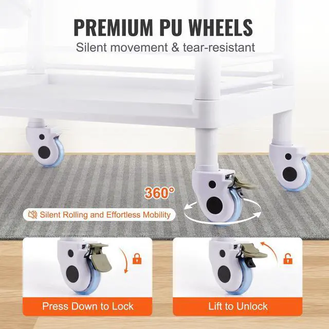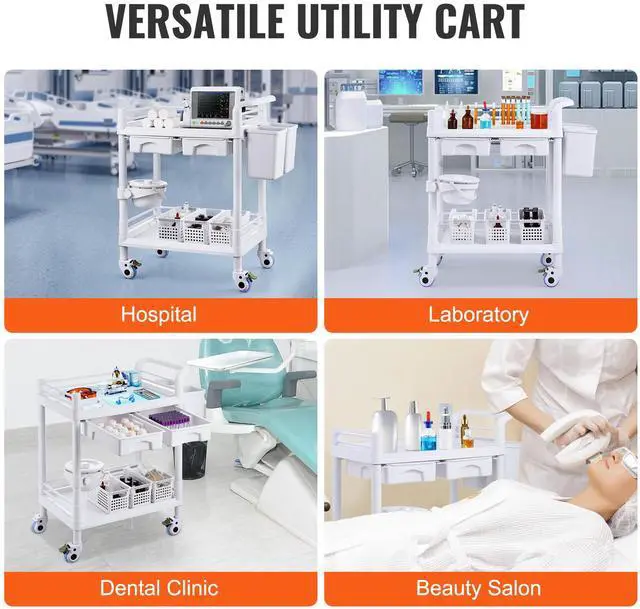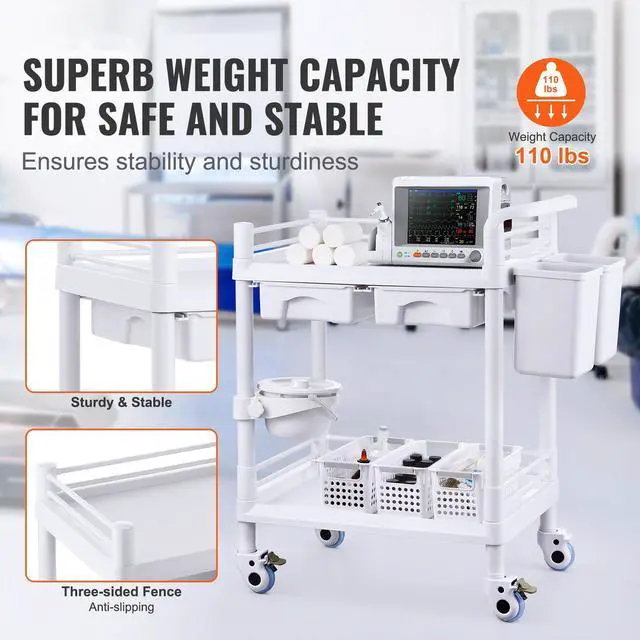 VEVOR 2 Tiers Lab Carts Mobile Medical Cart 2 Trays 2 Drawers 3 Trash Cans White, Trolley Storage Cart with PP Material, Lab Rolling Cart with 4 Silent Wheels for Lab, Clinic, Hospital, Salon, Office