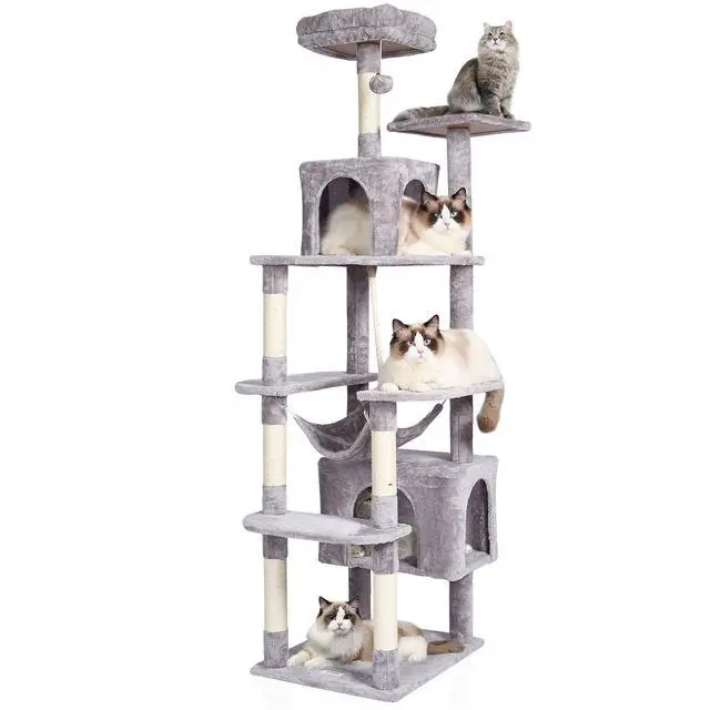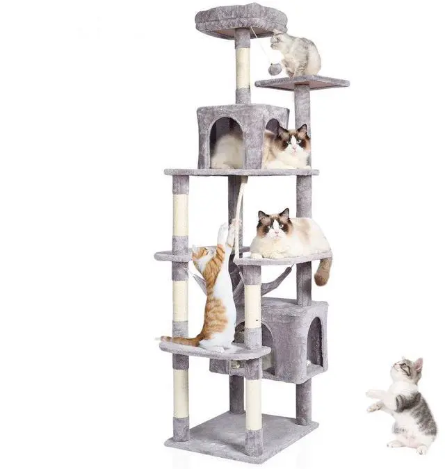 Cat Condo Size: 17.7"×11.8"×11.8"/45×30×30 cm;11.8"×11.8"×11.8"/30×30×30 cm,Hammock Size: 17.7"×13.8"/45×35 cm,Top Perch Size: 13.3"×13.3"×3.1"/34×34×8 cm,Number of Layers: 9,Number of Cat Condos: 2,Weight Capacity: 130 lbs/58.9 kg,Base Size: 21.6"×17.7"/55×45 cm,Color: Light Grey,Item Model Number: CAT795,Product Weight: 33.5lbs/15.2 kg,Product Size: 28.3"×27.5"×72"/72×70×183 cm
