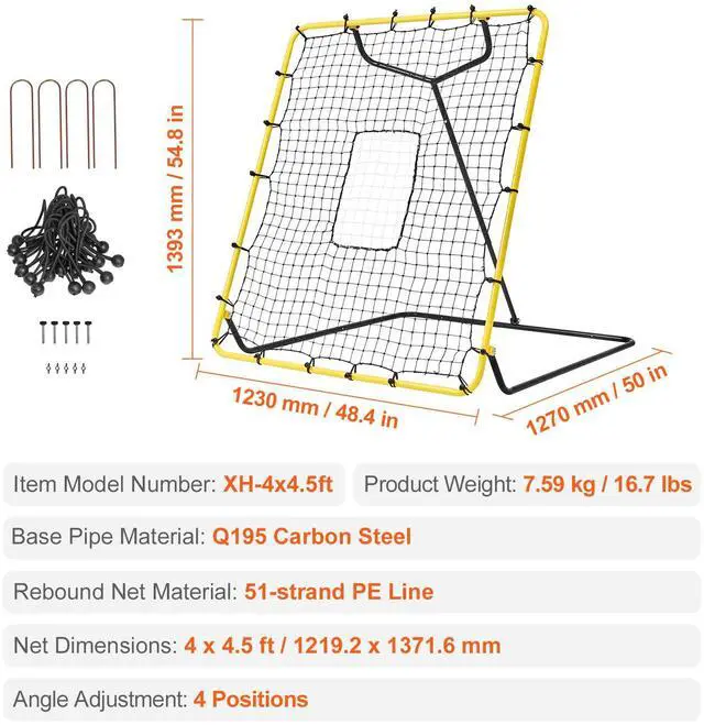 Angle Adjustment: 4 Positions,Base Pipe Material: Q195 Carbon Steel,Model: XH-4x4.5ft,Product Weight:7.59kg / 16.7 lbs,Product Dimensions: 1393 x 1230 x 1270 mm / 54.8 x 48.4 x 50 in,Rebound Net Material: 51-strand PE Line,Net Dimensions: 4 x 4.5 ft / 1219.2 x 1371.6 mm
