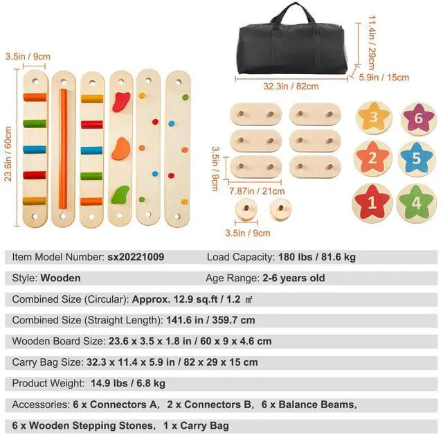 Combined Size (Circular): Approx. 12.9 sq.ft/1.2 ,Load Capacity: 180 lbs/81.6 kg,Age Range: 2-6 years old,Item Model Number: sx20221009,Product Weight: 14.9 lbs/6.8 kg,Style: Wooden,Combined Size (Straight Length): 141.6 in/359.7 cm,Wooden Board Size: 23.6 x 3.5 x 1.8 in/60 x 9 x 4.6 cm,Carry Bag Size: 32.3 x 11.4 x 5.9 in/82 x 29 x 15 cm