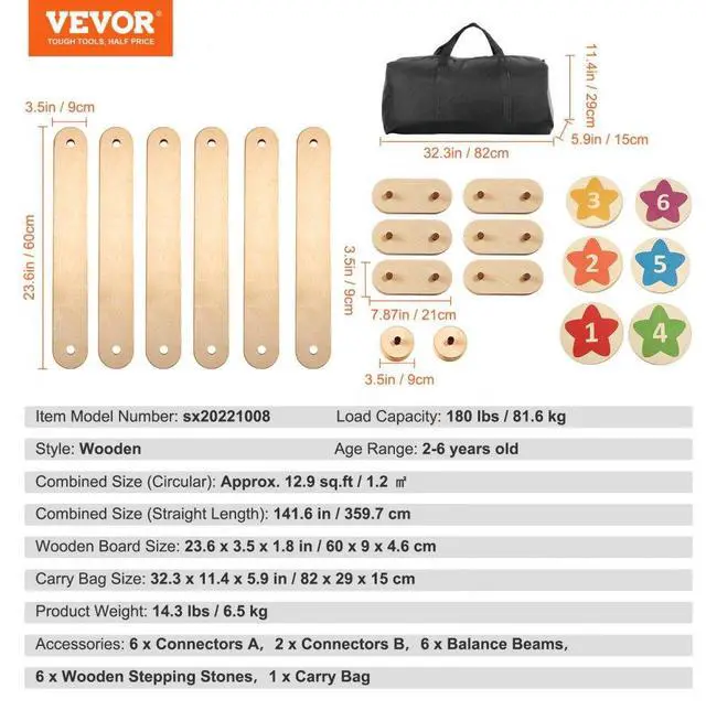 Combined Size (Circular): Approx. 12.9 sq.ft/1.2 ,Load Capacity: 180 lbs/81.6 kg,Age Range: 2-6 years old,Item Model Number: sx20221008,Product Weight: 14.3 lbs/6.5 kg,Style: Wooden,Combined Size (Straight Length): 141.6 in/359.7 cm,Wooden Board Size: 23.6 x 3.5 x 1.8 in/60 x 9 x 4.6 cm,Carry Bag Size: 32.3 x 11.4 x 5.9 in/82 x 29 x 15 cm