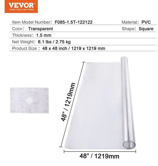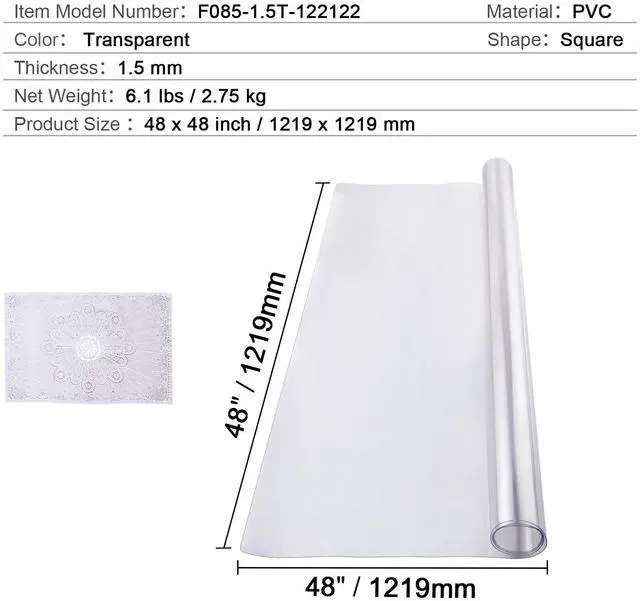 Thickness: 1.5 mm,Shape: Square,Table Protector Size: 48x48 inch / 1219x1219mm,Color: Transparent,Item Model Number: F085-1.5T-122122,Material: PVC,Net Weight: 6.1 lbs / 2.75 kg