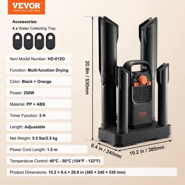 Power Cord Length: 1.5 m,Function: Multi-function Drying,Temperature Control: 40°C - 50°C (104°F - 122°F),Length: Adjustable,Color: Black + Orange,Item Model Number: HD-012O,Material: PP + ABS,Product Dimensions: 15.2 × 9.4 × 20.9 in385 × 240 × 530 mm,Net Weight: 5.5 lbs/2.5 kg,Power: 250W,Timer Function: 3 H