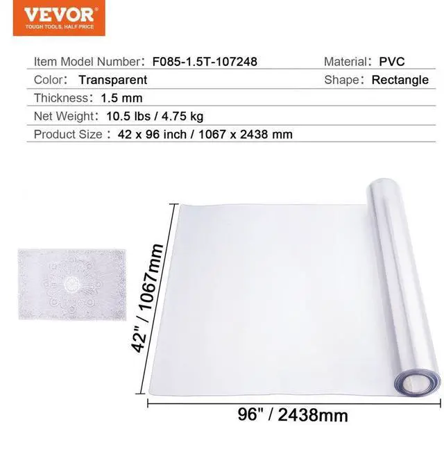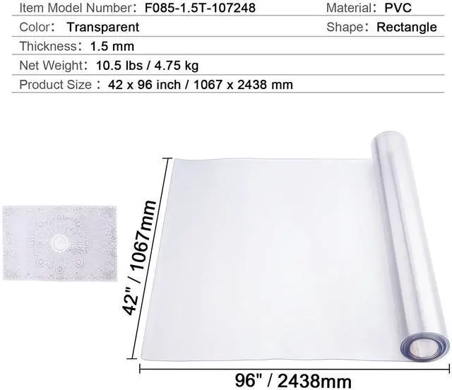 Thickness: 1.5 mm,Shape: Rectangle,Table Protector Size: 42x96 inch / 1067x2438mm,Color: Transparent,Item Model Number: F085-1.5T-107248,Material: PVC,Net Weight: 10.5 lbs / 4.75 kg