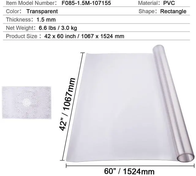 Item Model Number: F085- 1.5M -107155 Material: PVC Color: Transparent Thickness: 1.5 mm Shape: Rectangle Table Protector Size: 42x60 inch / 1067x1524mm Net Weight: 6.6 lbs / 3.0 kg