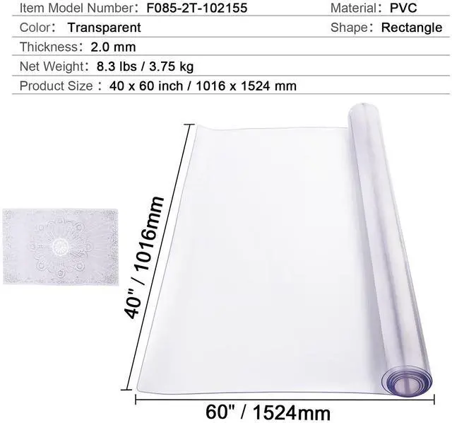 Thickness: 2.0 mm,Shape: Rectangle,Table Protector Size: 40x60 inch / 1016x1524mm,Color: Transparent,Item Model Number: F085-2T-102155,Material: PVC,Net Weight: 8.3 lbs / 3.75 kg