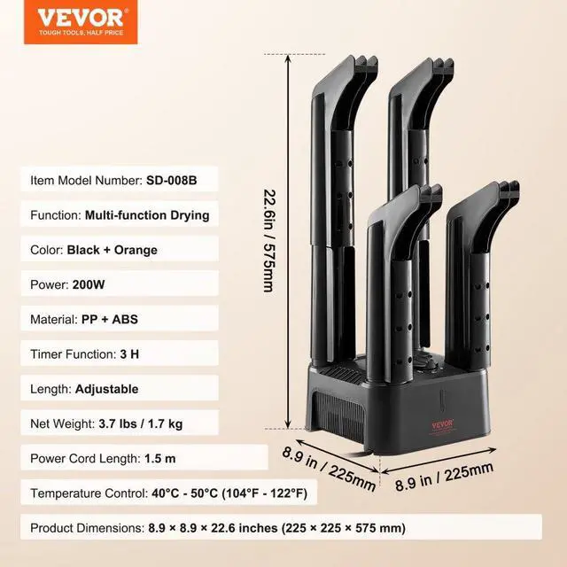 Power Cord Length: 1.5 m,Function: Multi-function Drying,Temperature Control: 40°C - 50°C (104°F - 122°F),Length: Adjustable,Color: Black + Orange,Item Model Number: SD-008B,Material: PP + ABS,Product Dimensions: 8.9 × 8.9 × 22.6 inches (225 × 225 × 575 mm),Net Weight: 3.7 lbs / 1.7 kg,Power: 200W,Timer Function: 3 H