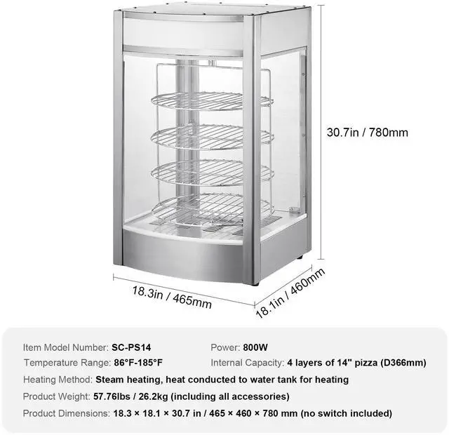 Internal Capacity: 4-Tier of 14" Pizza (D366mm),Item Model Number: SC-PS14,Product Weight: 57.8 lbs / 26.2 kg,Temperature Range: 86°F~185°F / 30~85,Heating Method: Steam heating, heat conducted to water tank for heating,Power: 800W,Product Size: 18.3 x 18.1 x 30.7 inch / 465 x 460 x 780 mm (no switch included)