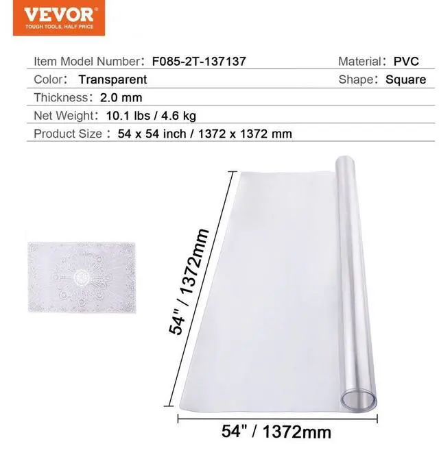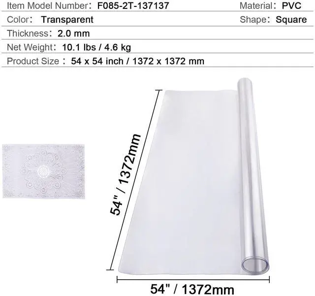 Thickness: 2.0 mm,Shape: Square,Table Protector Size: 54x54 inch / 1372x1372mm,Color: Transparent,Item Model Number: F085-2T-137137,Material: PVC,Net Weight: 10.1 lbs / 4.6 kg