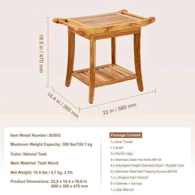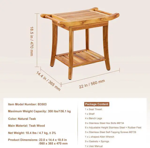 Shelf Dimensions: 12.2 x 14.0 x 0.6 in/310 x 357 x 14 mm,Color: Natural Teak,Item Model Number: B3503,Maximum Weight Capacity: 300 lbs/136.1 kg,Seat Dimensions: 13.0 x 15.1 x 0.9 in/330 x 384 x 22 mm,Product Dimensions: 22.0 x 14.4 x 18.5 in/560 x 365 x 470 mm,Net Weight: 10.4 lbs / 4.7 kg, ± 3%,Main Material: Teak Wood