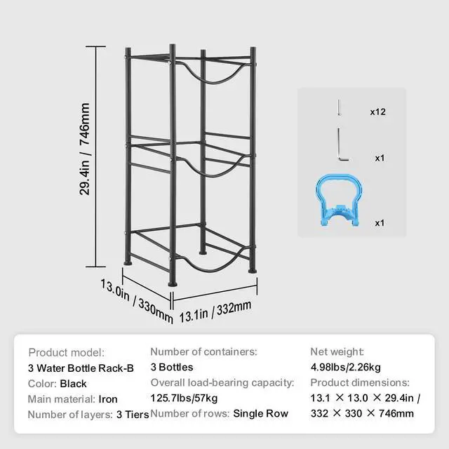 Primary Material: Iron,Number of Rows: Single Row,Capacity: 3 Bottles,Number of Tiers: 3 Tiers,Color: Black,Product Model: 3 Water Bottle Rack-B,Product Dimensions: 13.1 × 13.0 × 29.4 in / 332 × 330 × 746 mm,Net Weight: 4.83 lbs / 2.19 kg,Overall Load Capacity: 125.7 lbs / 57 kg