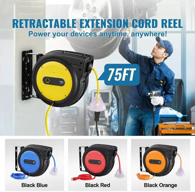 VEVOR Retractable Extension Cord Reel Power Cord Reel 75FT 14AWG/3C SJTOW