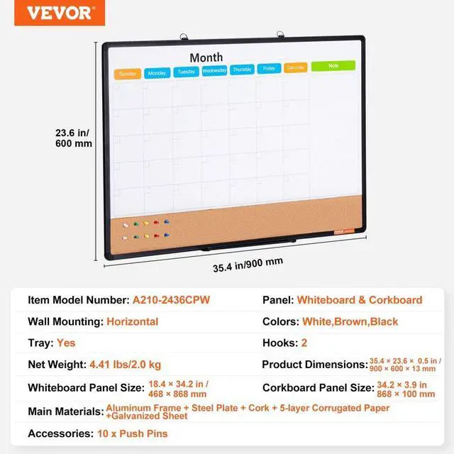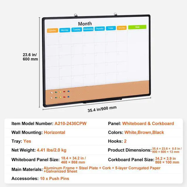 Whiteboard Panel Size: 18.4 × 34.2 in/468 × 868 mm,Panel: Whiteboard & Corkboard,Tray: Yes,Colors: White, Brown, Black,Main Materials: Aluminum Frame + Steel Plate + Cork + 7-layer Corrugated Paper Backboard+Galvanized Sheet,Item Model Number: A210-2436CPW,Wall Mounting: Horizontal,Hooks: 2,Corkboard Panel Size: 34.2 × 3.9 in/868 × 100 mm,Product Dimensions: 23.6 × 35.4 × 0.5 in/600 × 900 × 13 mm,Net Weight: 4.41 lbs/2.0 kg