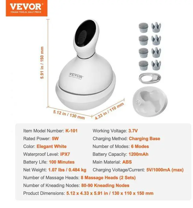 Number of Massage Heads: 8 Massage Heads (2 Sets),Working Voltage: 3.7V,Color: Elegant White,Product Dimensions: 5.12 x 4.33 x 5.91 in / 130 x 110 x 150 mm,Battery Capacity: 1200mAh,Battery Life: 100 Minutes,Number of Modes: 6 Modes,Number of Kneading Points: 80-90 Kneading Points,Item Model Number: K-101,Waterproof Level: IPX7,Rated Power: 5W,Net Weight: 1.07 lbs / 0.484 kg,Main Material: ABS