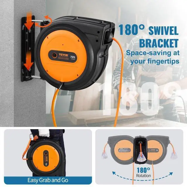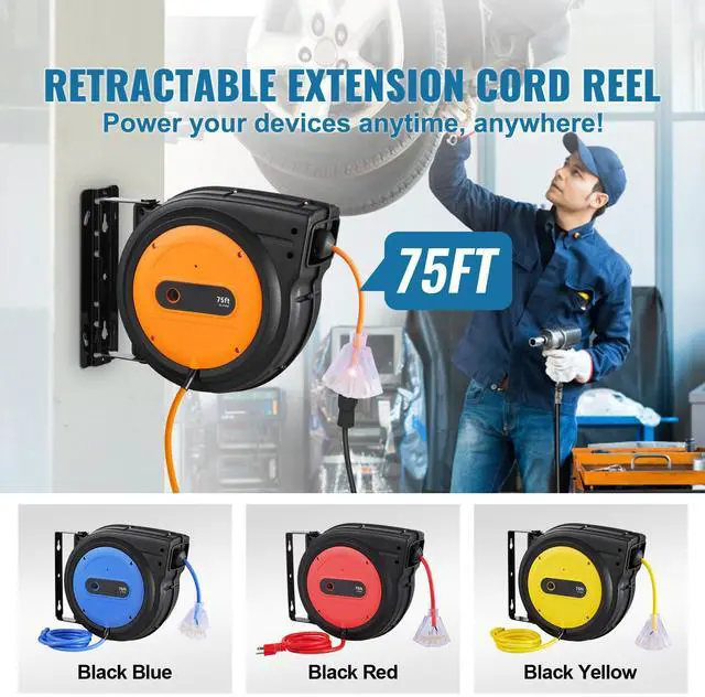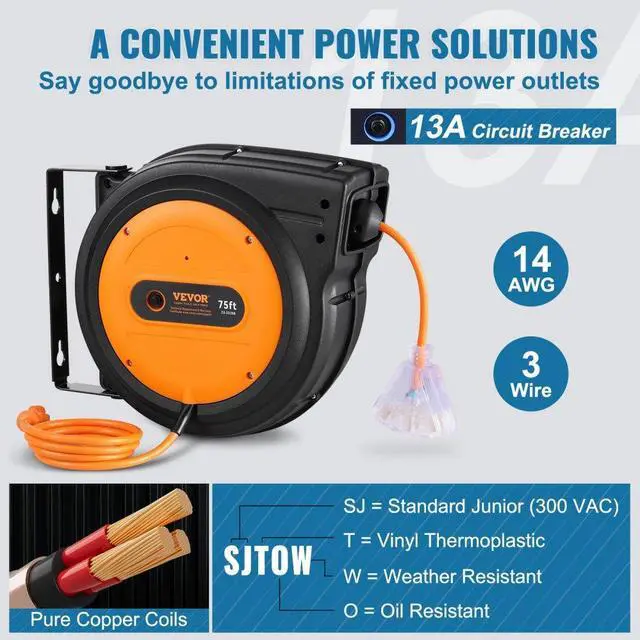 • VEVOR Retractable Extension Cord Reel Power Cord Reel 75FT 14AWG/3C SJTOW