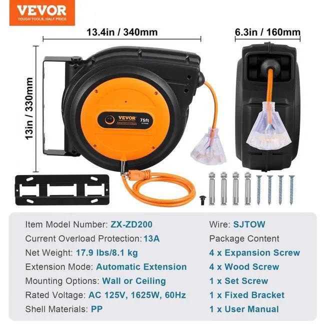 Extension Mode: Automatic Extension,Mounting Options: Wall or Ceiling,Current Overload Protection:13A,Item Model Number: ZX-ZD200,Shell Materials: PP,Wire: SJTOW,Net Weight: 17.9 lbs/8.1 kg,Rated Voltage: AC 125V, 1625W, 60Hz
