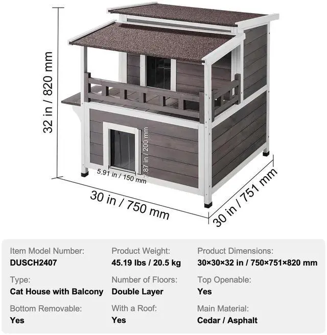 Top Openable: Yes,With a Roof: Yes,Type: Cat House with Balcony,Bottom Removable: Yes,Item Model Number: DUSCH2407,Product Weight: 45.19lbs/20.5 kg,Number of Floors: Double Layer,Product Dimensions: 30x30x32in/750x751x820mm,Main Material: Cedar/Asphalt