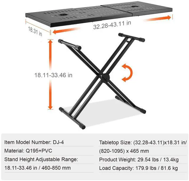 Tabletop Size: (32.28-43.11) x 18.31 x 1.18 in/(820-1095) x 465 x 30 mm,Stand Height Adjustable Range: 18.11-33.46 in/460-850 mm,Load Capacity: 179.9 lbs/81.6 kg,Item Model Number: DJ-4,Product Weight: 29.54 lbs/13.4 kg,Material: Q195+PVC,Stand Size: 19.49 x 2.76 x 39.17 in/495 x 70 x 995 mm,Product Size: (32.28-43.11) x 18.31 in/(820-1095) x 465 mm