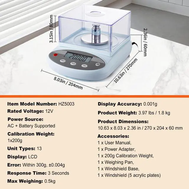 Calibration Weight: 1x200g,Max Weighing: 0.5kg,Power Source: AC + Battery Supported,Unit Types: 13,Response Time: 3 Seconds,Item Model Number: HZ5003,Product Weight: 3.97 lbs / 1.8 kg,Error: Within 300g, ±0.004g,Product Dimensions: 10.63 x 8.03 x 2.36 in / 270 x 204 x 60 mm,Display Accuracy: 0.001g,Rated Voltage: 12V,Display: LCD