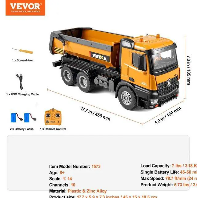 Load Capacity: 7 lbs/3.18 kg,Item Model Number: 1573,Single Battery Life: 45-50 minutes,Product Weight: 5.73 lbs/2.6 kg,Scale: 1:14,Material: Plastic & Zinc Alloy,Age: 8+,Channels: 10,Max Speed: 78.7 ft/min (24 m/min),Product Size: 17.7 x 5.9 x 7.3 in/45 x 15 x 18.5 cm