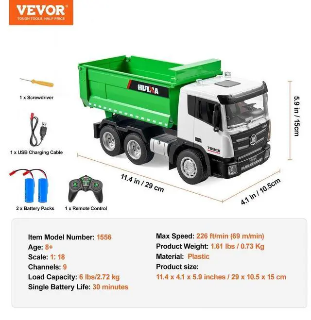 Christmas Gift! VEVOR RC Remote Control Dump Truck Toy Construction Vehicle Toy 9CH 1:18 Scale
