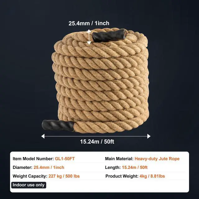 Weight Capacity: 227 kg / 500 lbs,Length: 15.24 m / 50 ft,Strands: 3,Item Model Number: GL1-50FT,Product Weight: 4 kg / 8.81 lbs,Main Material: Heavy-duty Jute Rope,Diameter: 25.4 mm / 1 inch