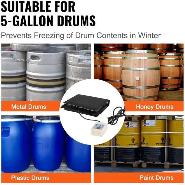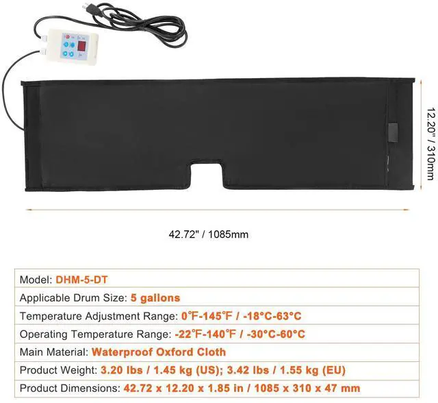 Temperature Adjustment Range: 0-145 / -17.78°C-62.78°C,Operating Temperature Range: -22-140 / -30°C-60°C,Model: DHM-5-DT,Product Weight: 3.20 lbs / 1.45 kg,Applicable Drum Size: 5 gallons,Product Dimensions: 42.72 x 12.20 x 1.85 in / 1085 x 310 x 47 mm,Main Material: Waterproof Oxford Cloth