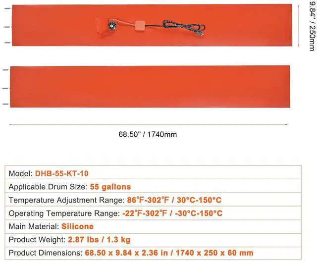 Temperature Adjustment Range: 86-302 / 30°C-150°C,Operating Temperature Range: -22-302 / -30°C-150°C,Model: DHB-55-KT-10,Product Weight: 2.87 lbs / 1.3 kg,Applicable Drum Size: 55 gallons,Product Dimensions: 68.50 x 9.84 x 2.36 in / 1740 x 250 x 60 mm,Main Material: Silicone